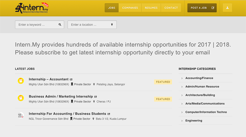 Seperti namanya, Intern.my merupakan satu platform untuk pelajar mencari peluang intership (latihan industri) di syarikat swasta. Platform ini adalah sesuai untuk majikan di luar sana yang tidak memerlukan pekerja sepenuh masa tetapi sedang mencari pekerja pelatih atau pelajar praktikal.