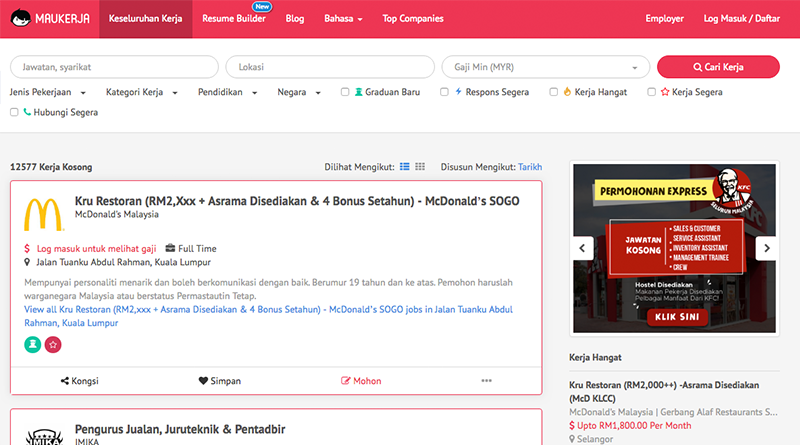 Selalunya laman Mudah.my ini hanya digunakan untuk menjual dan membeli barang secara online. Siapa sangka portal ini juga boleh digunakan oleh majikan untuk mengiklankan kekosongan kerja di syarikat mereka. Sebenarnya, terdapat kolum ‘Jobs’ yang menyenaraikan pelbagai kategori pekerjaan dengan kadar gaji yang ditetapkan.